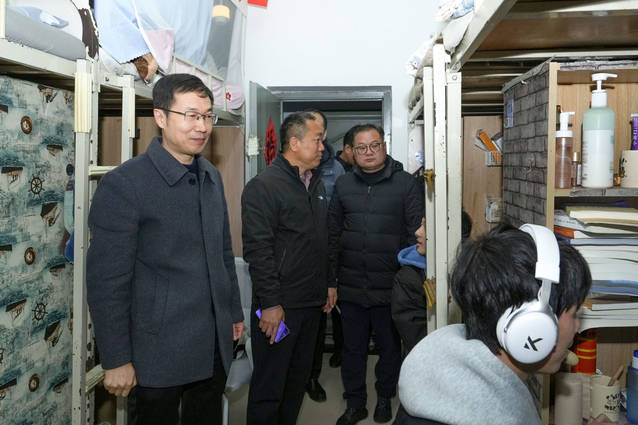 在学生宿舍区,检查组一行深入多个宿舍楼宇,实地仔细查看了宿舍内部环境。武玉国副校长重点检查了宿舍床帘的材质与悬挂情况、电源插座的规范使用与管理状况,并详细询问了日常安全管理的具体措施。针对检查情况,武玉国指出,学生宿舍是人员高度密集的场所,消防安全丝毫不能松懈。他要求各相关单位必须高度重视省教育厅前期安全检查中指出的相关问题,立即制定切实有效的整改方案,严格落实整改责任,彻底消除安全隐患。他强调,要加强学生安全教育与管理,严禁使用违规电器,确保用电安全,共同营造一个安全、整洁、和谐的住宿环境。