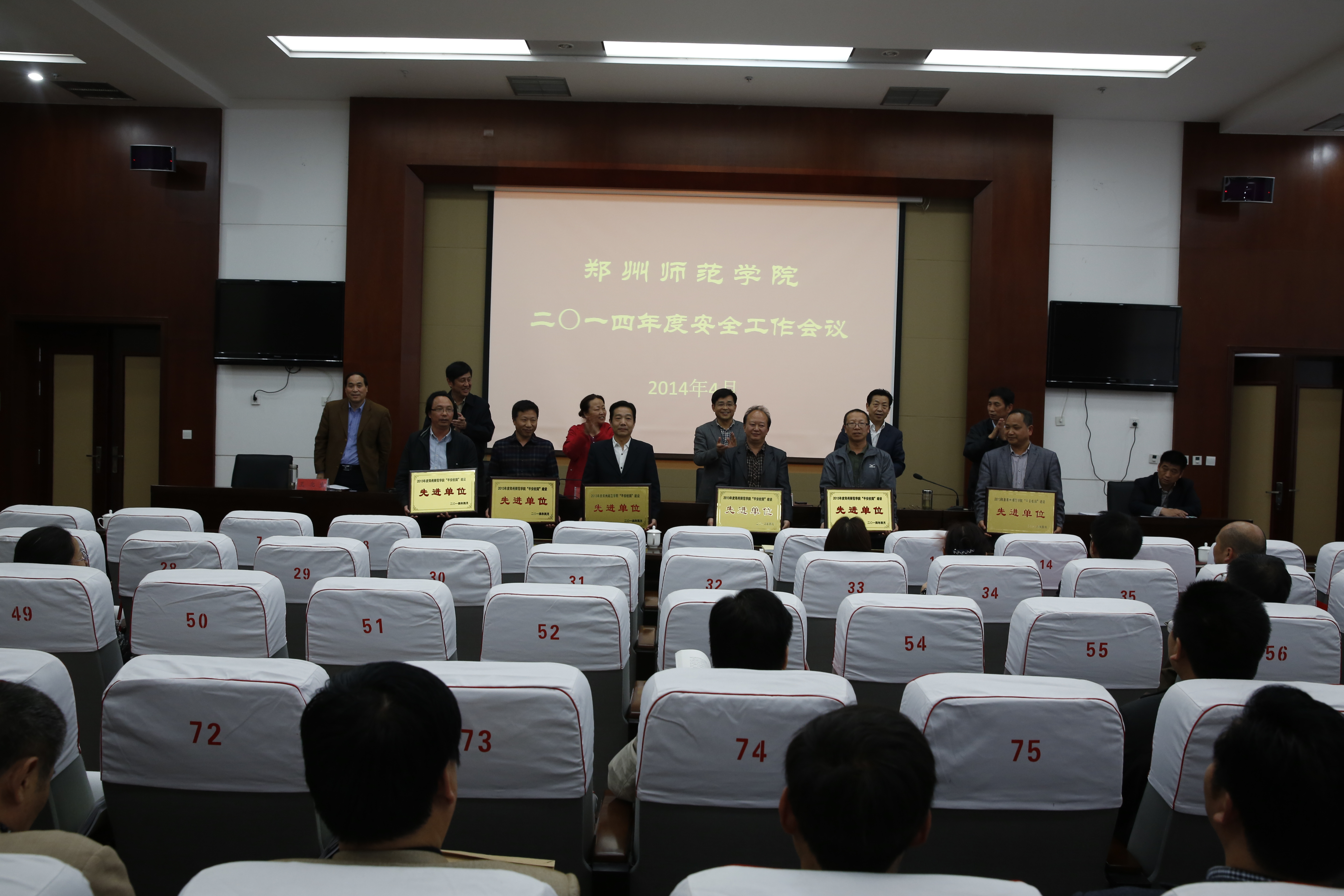 首先,副校长张建航宣读了《郑州师范学院关于表彰2013年度“平安校园建设先进单位”的决定》,校领导为受到表彰的文学院、数学与统计学院、教育科学学院、政治与公共管理系、教务处、财务处颁发了荣誉奖牌。随后,校长赵健代表学校与校内单位代表签订了2014年度校园综合治理和平安校园建设工作目标责任书。最后,赵健校长对学校上年度校园安全工作进行了全面总结,并安排部署了本年度全校安全稳定工作。
