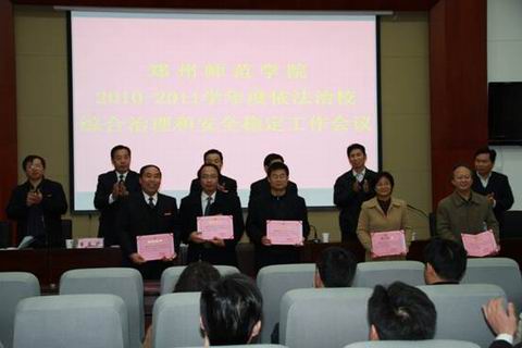 本次会议总结了去年学校依法治校、综合治理、安全稳定工作,安排了今后我校的安全稳定工作,签订了目标责任书。工会主席崔东升宣读了《郑州师范学院关于表彰2009―2010学年“平安校园建设先进集体”的决定》和《郑州师范学院2009―2010学年公共财物安全管理奖励决定》。校领导为政治系、数学系、初教部、继续教育部、教务处、基建处等受表彰的部门颁发了荣誉证书。