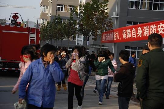 在消防官兵讲解安全注意事项及火场逃生知识后,消防疏散演练正式开始。现场模拟火情发生、疏散应急预案迅速启动:管理员及时上报火情、打开逃生通道、使用楼内消防器材灭火,组织学生安全撤离;接报的保卫部门人员鸣响警笛,迅速赶赴现场;公寓内学生在引导员帮助下有秩序地撤至安全地带,在操场集结后清点人数迅速报告……